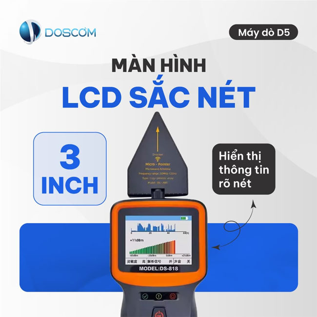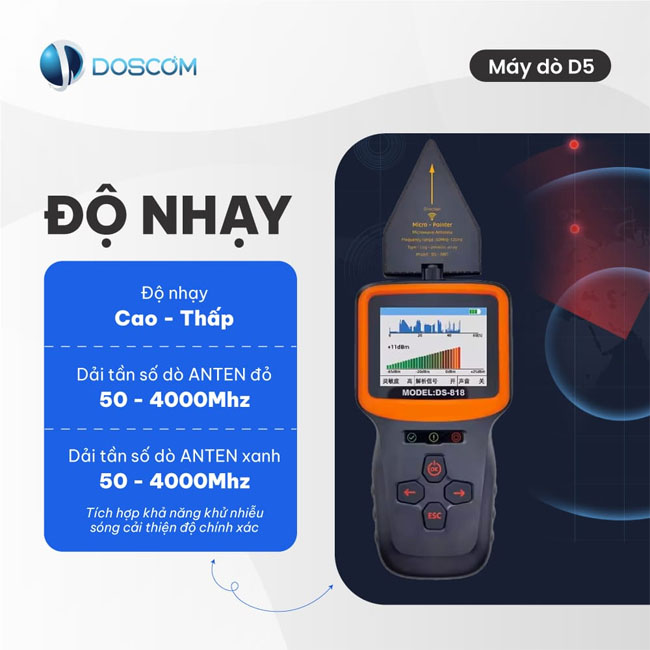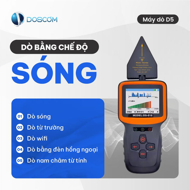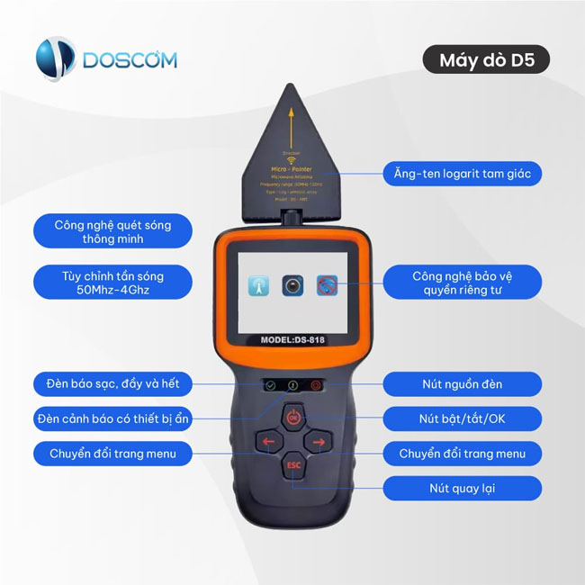 Máy phát hiện camera D5 là một trong những dòng sản phẩm công nghệ mới nhất của Doscom. D5 có khả năng phát hiện camera quay lén hoặc thiết bị nghe lén bất kể chúng hoạt động bằng dây hoặc không dây.